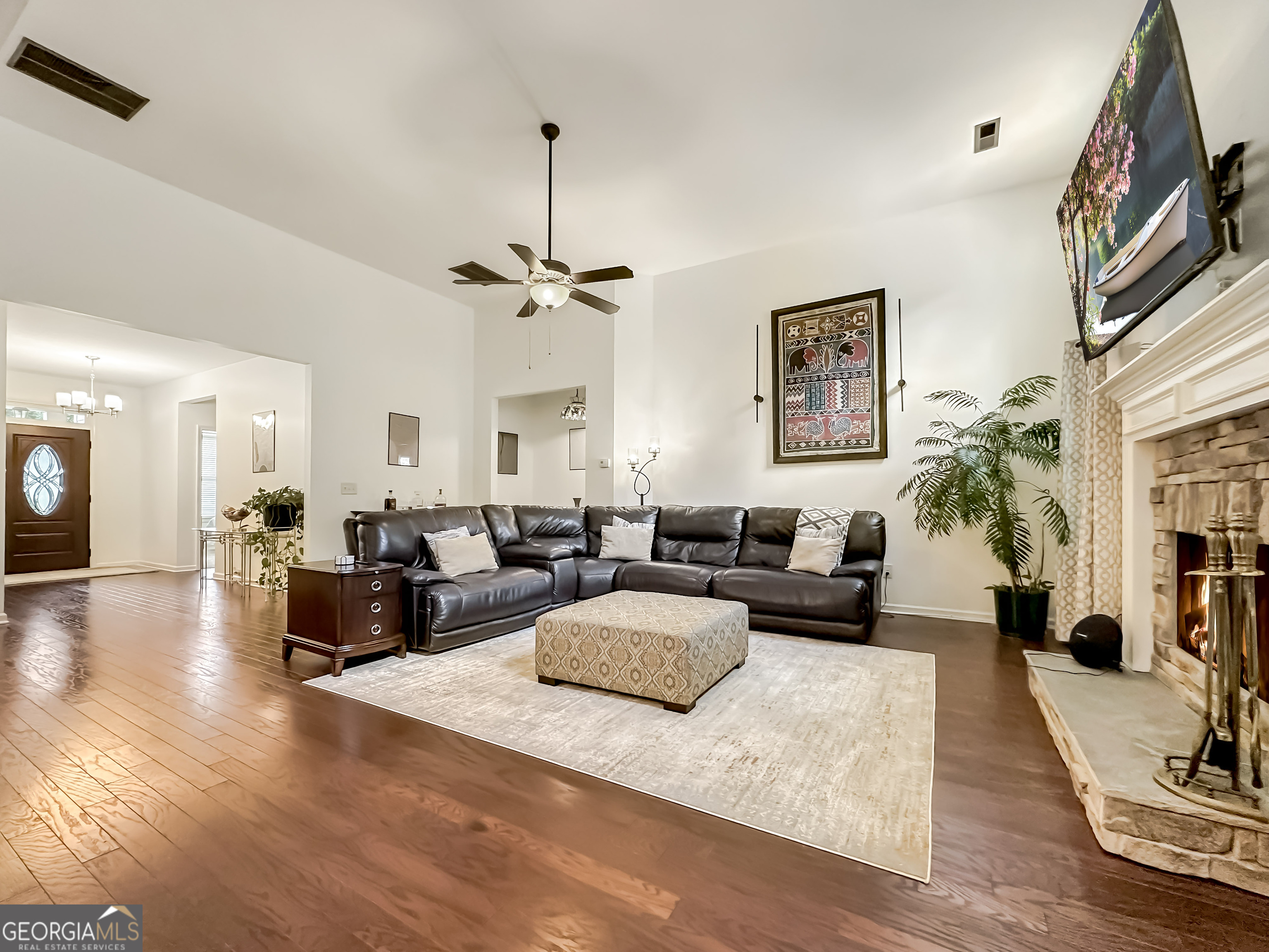 Welcome to this beautifully appointed home in desirable Senoia, offering nearly 4,000 square feet of thoughtfully designed living space and exceptional upgrades throughout. From the durable concrete siding and stone accents to the inviting covered front porch and screened-in back porch, this home delivers impressive curb appeal and wonderful outdoor living. Inside, you'll find a spacious and functional layout ideal for both everyday living and entertaining. The formal dining room welcomes you with coffered ceilings and detailed trim work. The family room features beautiful wood flooring and a gas fireplace with stone surround and ceramic logs, creating a warm and inviting atmosphere. The chef's kitchen opens seamlessly to the family room and is equipped with abundant cabinetry, a center island, pantry, stainless steel appliances, and a large breakfast area. The main level includes four bedrooms and three full baths. The owner's suite offers a private retreat with dual vanities, linen closets, a ceramic tile shower, garden tub, and a generous walk-in closet that conveniently connects to the laundry room. Upstairs has one bedroom plus incredible flexibility with multiple finished spaces currently used as an exercise room, office, and bonus room. One Full Bathrooms Upstairs making this level ideal for guests, teens, or multi-generational living. The fenced backyard is a true retreat, complete with a powered outbuilding-perfect for hobbies, a workshop, or additional storage-along with low-voltage exterior lighting and mature, professional landscaping. The oversized side-entry two-car garage provides generous parking and storage space. Additional features include a generator, water heater recirculating pump, irrigation system, and numerous thoughtful upgrades throughout. This exceptional Senoia home truly has it all-space, upgrades, versatility, and charm. Schedule your private showing today!